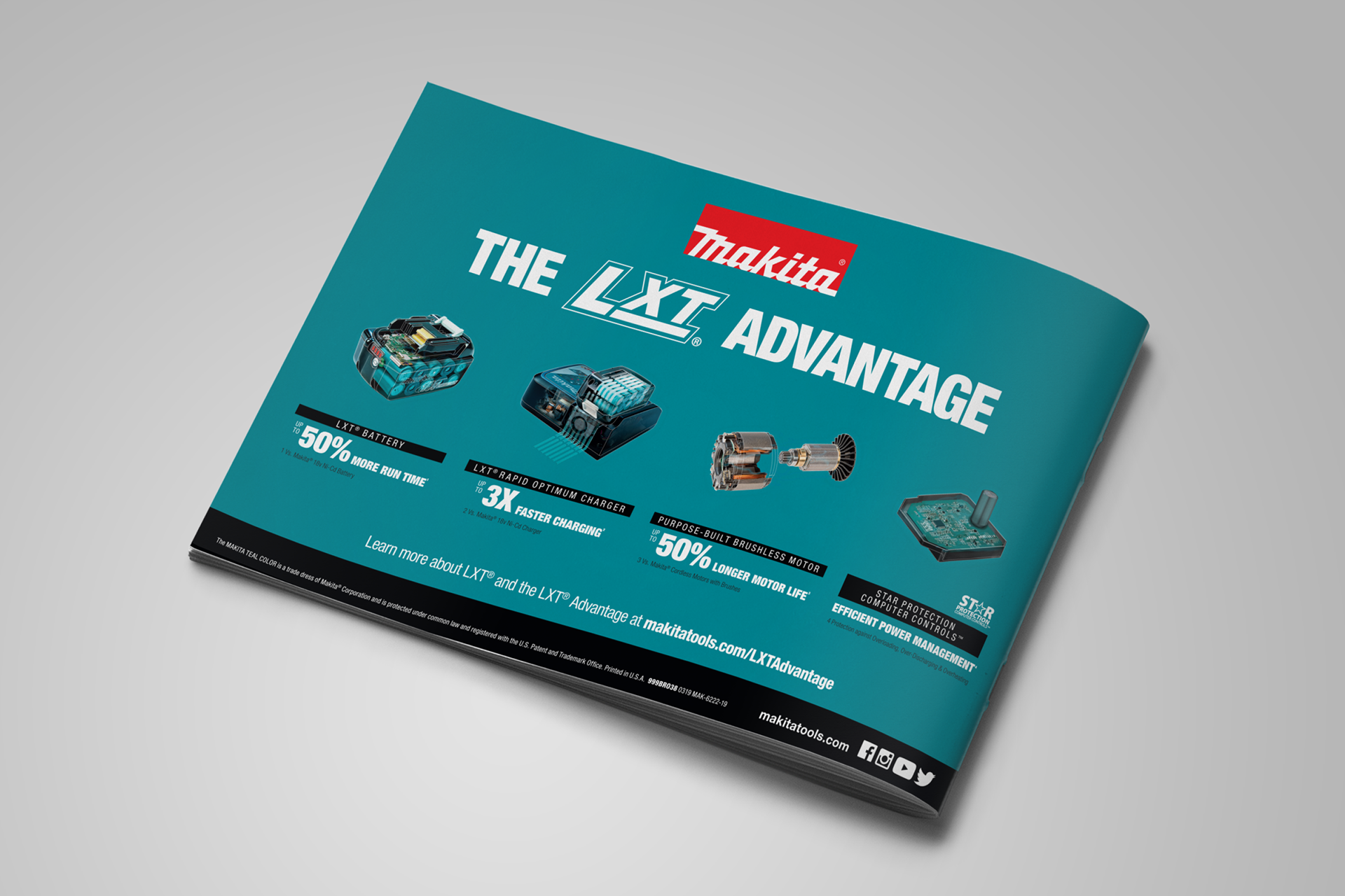 Designed the 2018 Makita® STAFDA brochure to spotlight their rapidly growing LXT® 18V and X2® 36V battery tool lineup while driving awareness of new brand technologies.