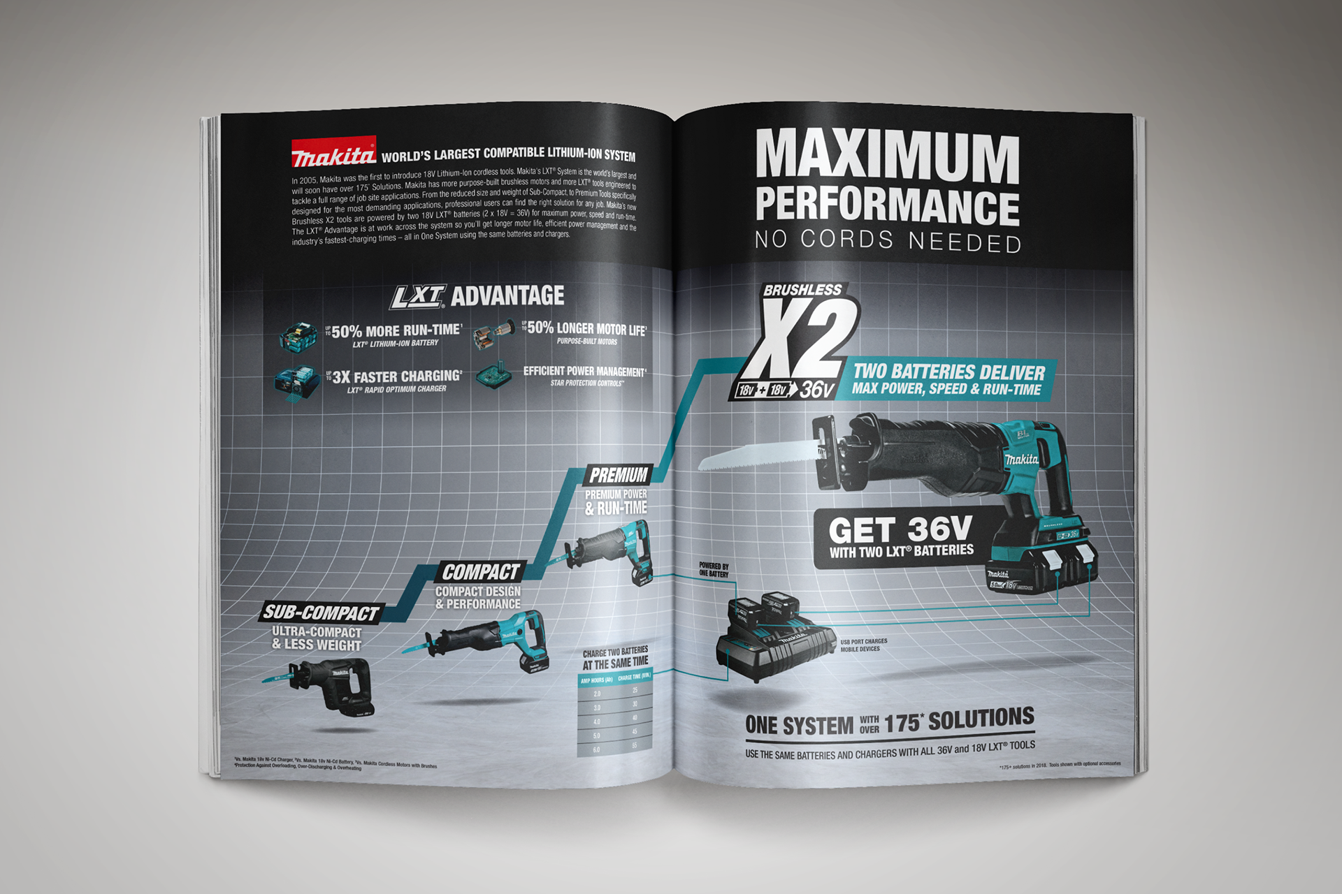 Designed the 2017 Makita® "No Cords Needed" brochure to drive adoption of their latest X2 cordless technology and industry-leading 36V lithium-ion system.